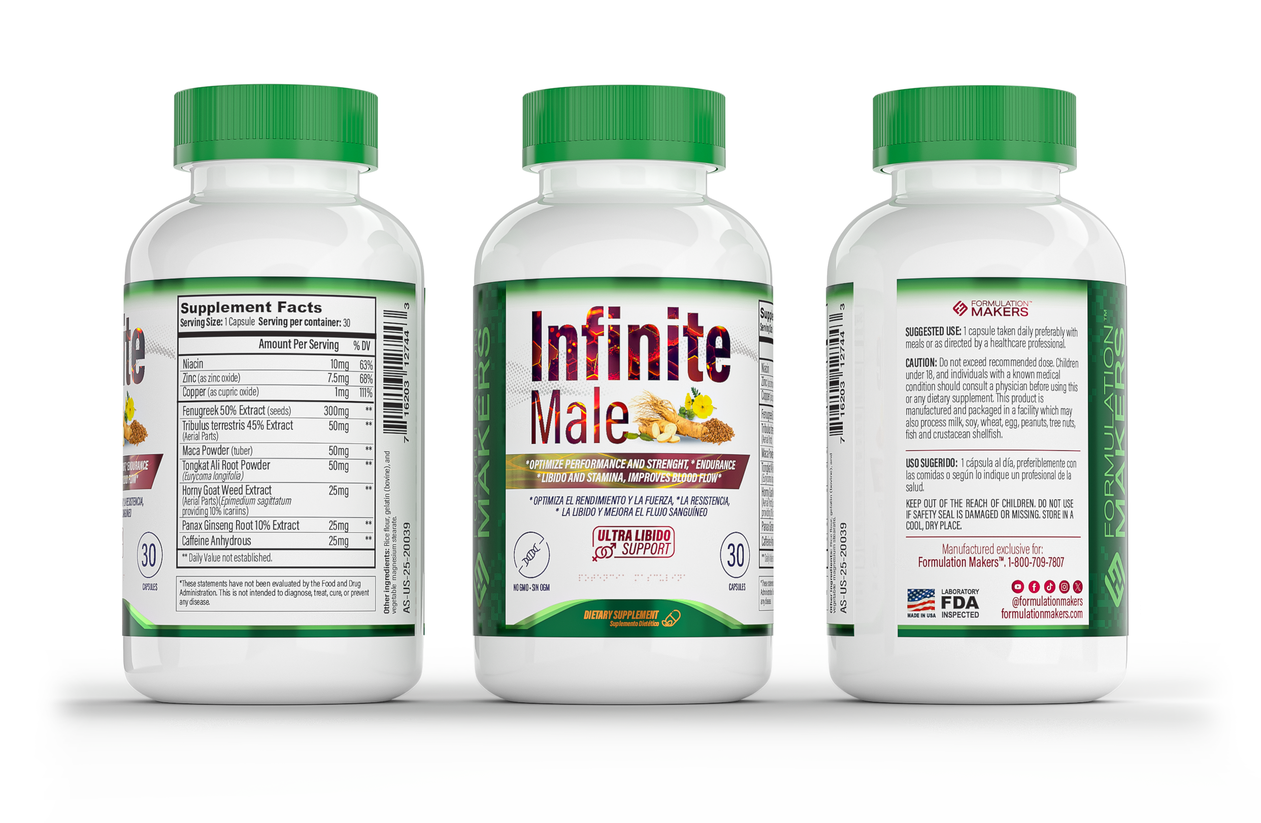 Infinite Male 30 cápsulas de Formulation Maker es un suplemento diseñado para potenciar la energía, la libido y el rendimiento masculino de forma integral.