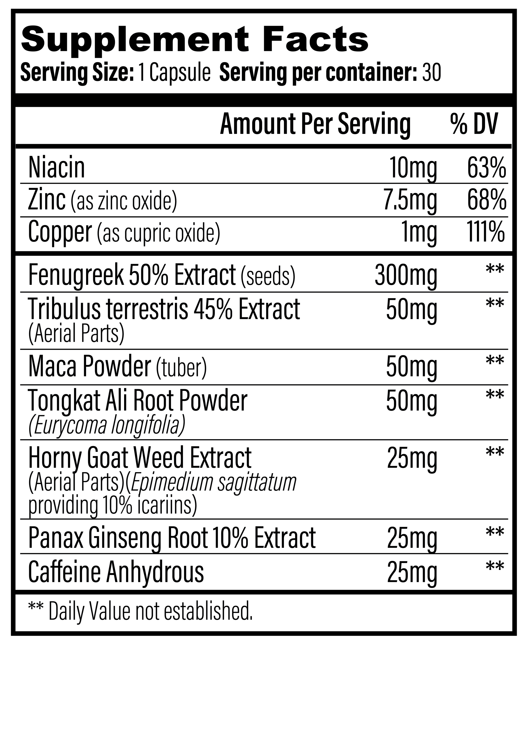 Su fórmula combina ingredientes naturales reconocidos como maca, tribulus terrestris, ginseng y tongkat ali, junto con minerales esenciales como zinc, cobre y niacina, que contribuyen al bienestar masculino.